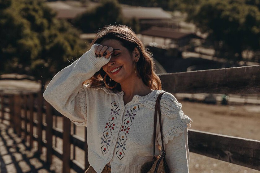 Esta blusa es una opción romántica y queda genial con la falda de Sfera. Un conjunto bicolor súper elegante que llevaremos tanto de día como de noche. Sus detalles de encaje elevan su estética y los hombros caídos añaden un aspecto más relajado. Pertenece a la nueva colección y su cuello es tipo mao. El precio en la web oficial de H&M es 39,99 euros.