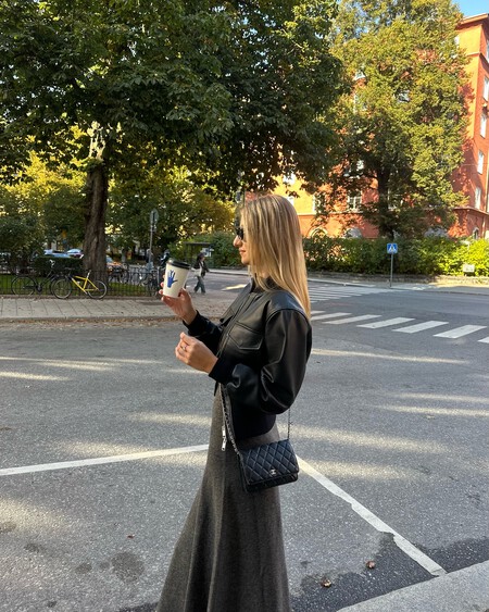 Esta propuesta de la influencer María Fernández Rubies es muy cómoda y tiene mucho rollazo. Un look formado por una falda midi y un jersey oversize que queda genial con las Nike Cortez. Para elevar el conjunto, unas joyas doradas de aspecto vintage son la mejor opción para añadir un aspecto muy cool.