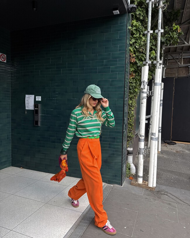 Esta propuesta de la influencer Nina Sandbech es una opción muy acertada para combinar el bolso bandolera de Parfois. Un look muy colorido formado por unos pantalones naranjas y un jersey del mismo tono. Igualmente, para darle un aspecto más primaveral, podemos sustituirlo por una blusa blanca romántica.