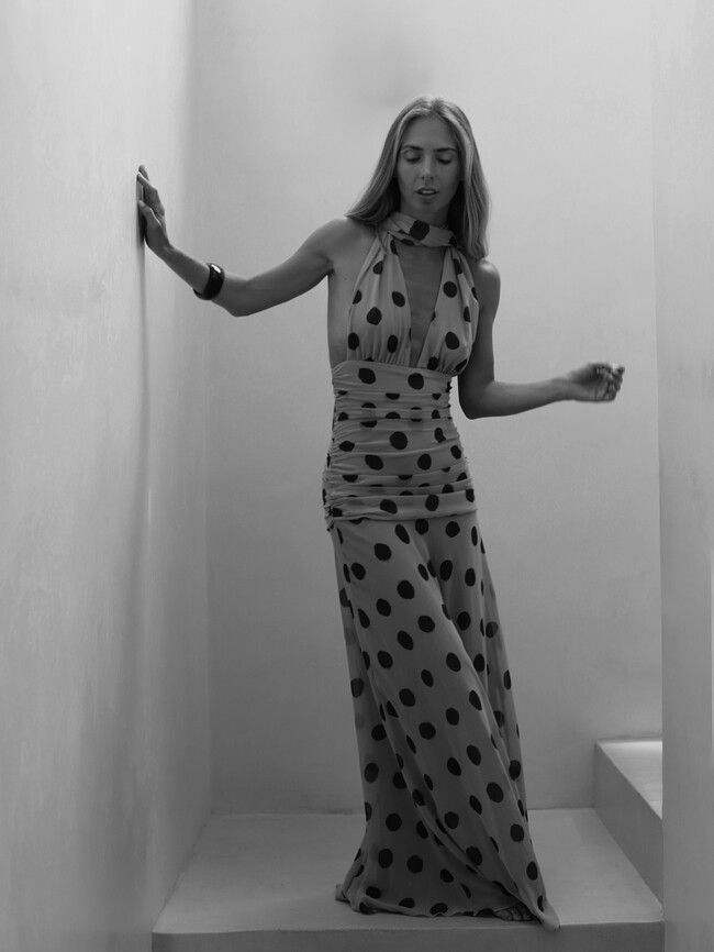 Este modelo es color negro con lunares blancos y es un lienzo para sacarle el máximo partido posible también en verano, siendo una gran opción para una cena elegante. Está hecho con un tejido fluido y con escote palabra de honor. Además, incluye el adorno del fular a juego ideal para agregar armonía al conjunto.