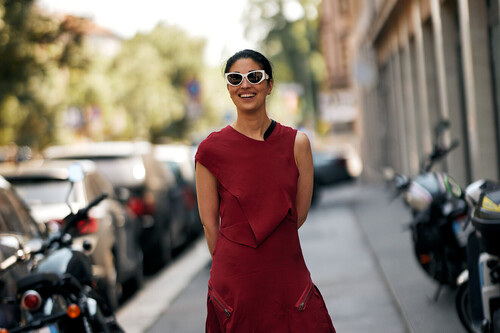 Se trata de un conjunto repleto de flecos -pura tendencia- en color rojo o lo que es lo mismo, el que será el amarillo mantequilla del otoño 2026. La parte de arriba en sisa tiene una silueta cruzada que potencia el estilo boho de los flecos y la falda, juega el despiste - ¿es midi, es mini?- con una estética repleta de movimiento.