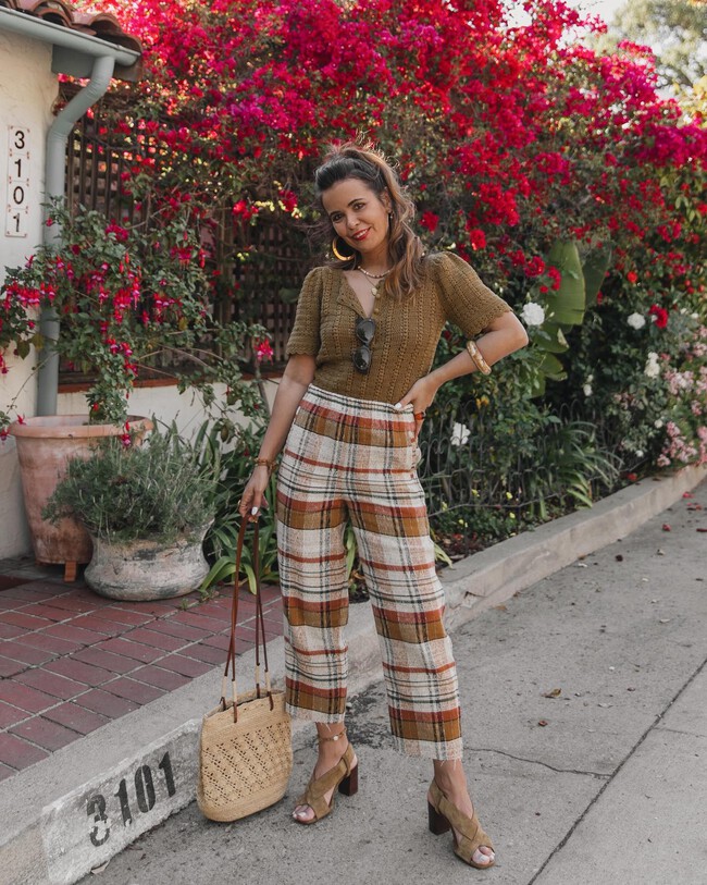 Su estética es maximalista y llamativa con un corte tobillero. Es ideal para las chicas bajitas, porque no tendrán que darse paseos hasta la costurera para coger los bajos. Es de color marrón oscuro, uno de los más populares y está combinado con cuadros beige que destacan muchísimo, pero sin resultar excesivo.