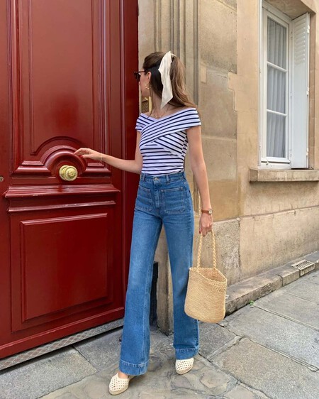En esta propuesta de Marielle Haon, la base del look es muy sencilla con unos pantalones vaqueros de corte recto y un top de escote bardot entallado. El bolso de rafia juega un papel principal en el outfit con vibes veraniegas y las alpargatas similares a las de Marypaz, que aportan altura y equilibrio al conjunto. El lazo del pelo es del mismo tono y las joyas minimalistas elevan el estilismo.