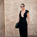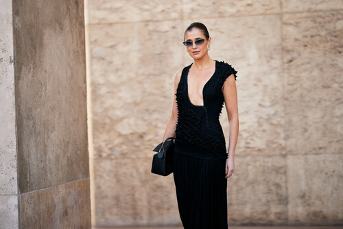 Un total look black es muy fino y es la mejor elección para una cena elegante de verano. En esta propuesta del street style de París, la combinación de un top con volantes pura tendencia y un pantalón negro con unos salones verdes es un acierto. Los pendientes de Pandora en forma de corazón darán mucho rollazo y el bolso con detalles metalizados aporta mucha luz y brillo.