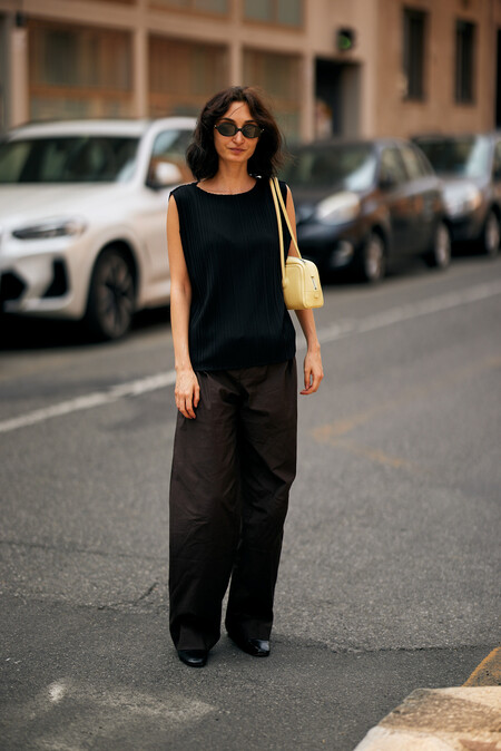 El marrón chocolate combinado con el amarillo mantequilla ha sido uno de los descubrimientos del año. Una opción muy elegante que podemos llevar tanto en looks de día como de noche. Esta propuesta del street style de Milán es muy atrevida porque incorpora elementos muy vibrantes como los zapatos de lunares o el cinturón con el detalle de lazo.