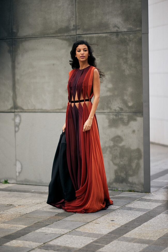 En esta propuesta del street style de París, el protagonista es un vestido largo degradado y con tonos cálidos. Tiene detalles cut out en la cintura y es una elección acertada para cualquier boda de tarde en verano. Además, acompaña el look con una americana negra, que sustituiría por un fular de los colores de la prenda principal.