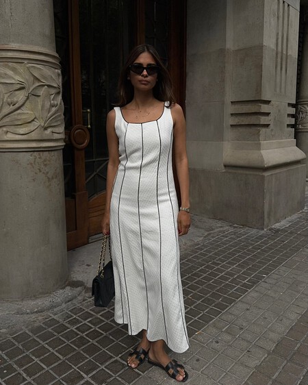 Los lunares han vuelto con mucha fuerza en la primavera 2026 y esta propuesta de la influencer Lauren Crowe es una opción en tendencia que podemos llevar con las sandalias Pikolinos. Un look que ha completado con una camiseta básica negra y una chaqueta camel.