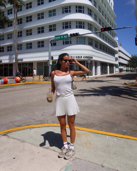 En esta propuesta veraniega, la falda plisada es clave para añadir una estética Teniscore al look de calle. Maria Fernández Rubies eleva el outfit con un top del mismo color y unas zapatillas New Balance con calcetines blancos. Las gafas oscuras en tendencia y el semirrecogido completan este conjunto y si queremos darle un toque más chic al estilismo, unas sandalias estilo romano serían la clave. Sin duda, una elección correcta para hacer turismo durante esta temporada estival.