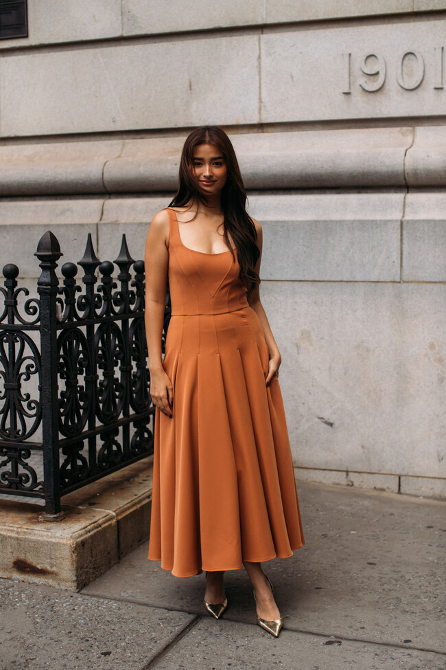 Siempre gastamos un pastizal en los outfits de invitada, pero en esta ocasión, hemos encontrado los zapatos que podemos llevar con la mayoría de los vestidos que compremos, así que será un calzado todoterreno con un toque muy cool. En esta propuesta del street style de Nueva York, el protagonista es un vestido naranja que queda genial con los tacones de Merkal.