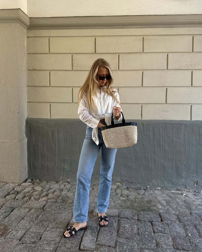 Por último, viajar en avión nunca es fácil, especialmente cuando debemos reducir al máximo nuestro equipaje para evitar facturar. Este capazo XXL es perfecto, ya que permite llevarlo todo y es apto para cabina. Además, su diseño discreto lo hace muy fácil de combinar con un look como este: vaqueros blancos, zapatillas Adidas Samba negras y una biker que añade un toque de estilo.
