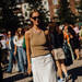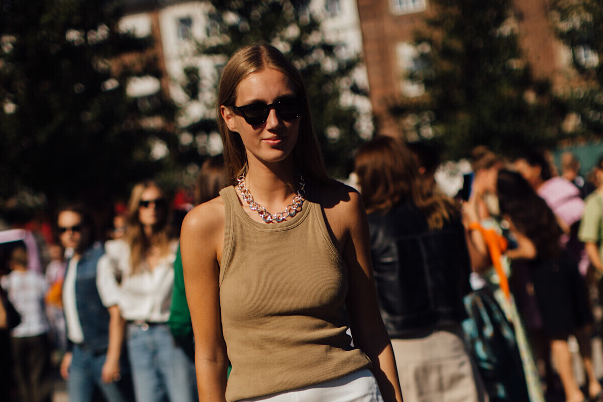 Las faldas satinadas también nos acompañan esta temporada porque añaden elegancia a cualquier look. En esta propuesta del street style de Copenhague la vemos combinada con un top en tono beige que añade un contraste más informal al outfit.