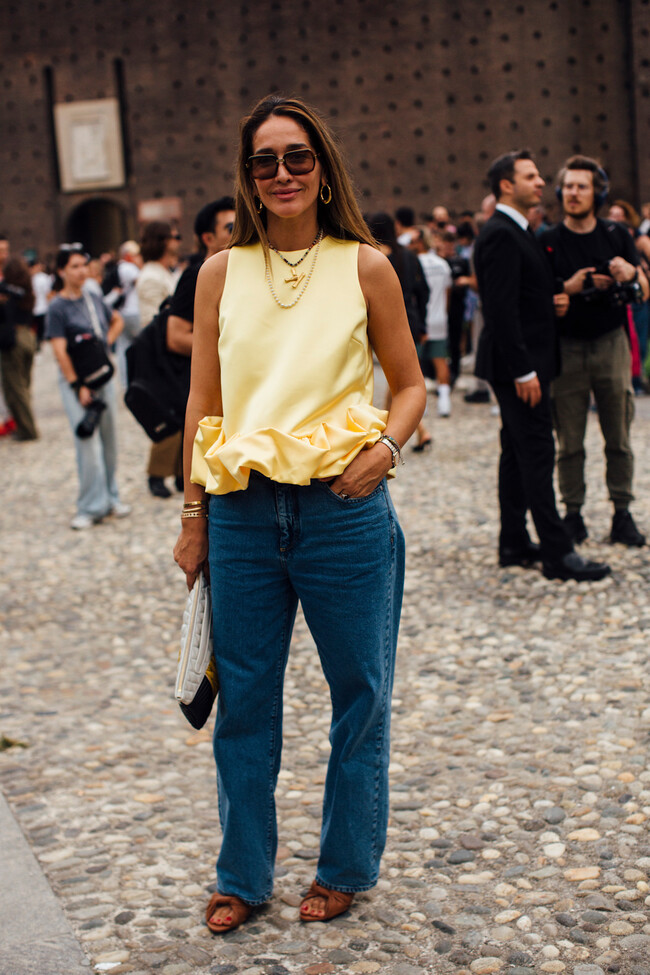 Parecen tan cómodas que no descarto llevármelas para salir de fiesta o cenar con amigas (o con mi pareja) y para muestra, este look con vaqueros wide leg que encontramos en el street style. El color marrón de las sandalias combina a la perfección con el top repleto de dramatismo amarillo mantequilla. Una combinación perfecta que solo matizaría con un bolso bandolera tamaño mini en lugar de la cartera de mano (por multiplicar aún más la comodidad).