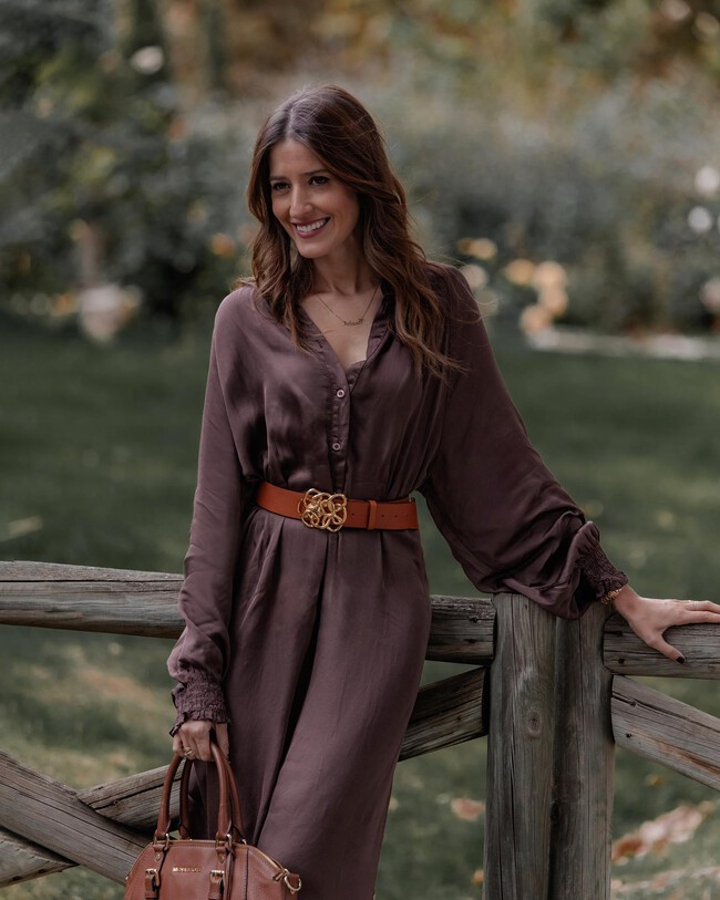 Se trata de un vestido largo marrón chocolate, uno de los tonos favoritos que ya vimos en la pasarela y ha saltado al street style tanto en prendas como zapatos y complementos. Una opción ideal que podemos lucir con otros colores como el verde oliva, el celeste y el rosa pastel, todos pura tendencia.