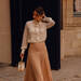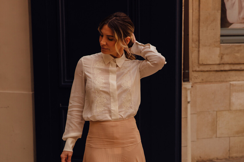 En esta propuesta del street style de París, la protagonista es la falda plisada en tono crudo. Es muy elegante y combinada con la blusa blanca con bordados tendremos un look discreto y acertado. Las sandalias con plataforma XXL de Geox nos vendría de perlas para darle unos centímetros al conjunto, sin renunciar al estilo ni a la comodidad.