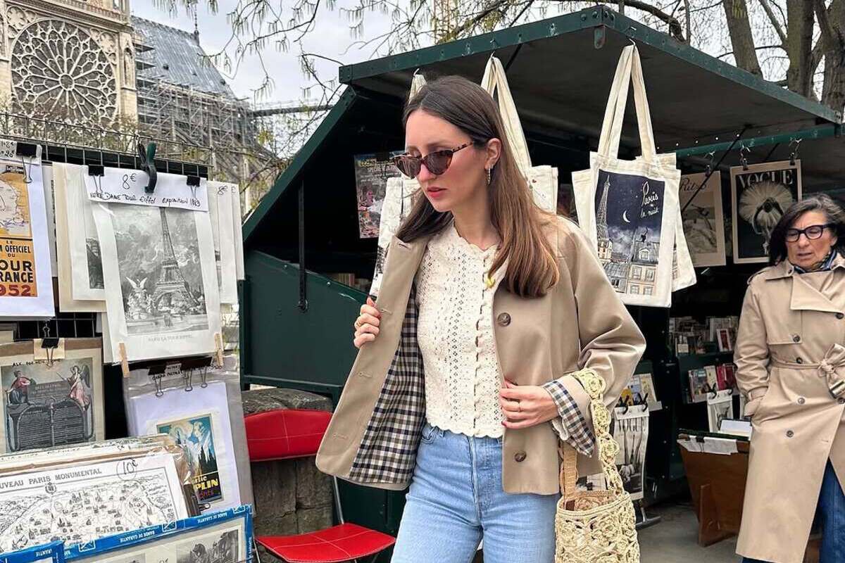 En esta propuesta vemos que podemos marcarnos un auténtico lookazo hecho con básicos. Eso sí, el bolso tiene un diseño muy original y ayuda a elevar el outfit perfecto para recorrer las calles de París con mucho estilo como hace la influencer parisina Marielle Haon. La chaqueta de entretiempo estilo gabardina juega un papel muy importante porque es sencilla y un clásico que siempre debemos tener siempre a mano. Además, las bailarinas con vibes de Chanel son un plus cuando se trata de caminar sin perder el estilo. Si buscamos un estilo más veraniego, podríamos sustituir los vaqueros por un pantalón de lino y unas sandalias.