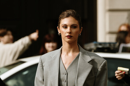 Poniendo un ejemplo de un look elegante para ir al trabajo, encontramos esta propuesta del street style de Milán. Un dos piezas gris, con chaleco incluido, combinado con un bolso rojo que le da un toque vibrante al outfit. Las sandalias Geox son del mismo tono, hacen match y crean un equilibrio perfecto, quitándole seriedad.