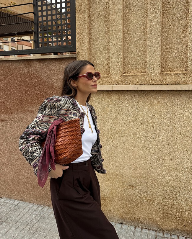 Para completar el look, un bolso bandolera en tono marrón chocolate será un acierto y hará match con los zapatos. El pañuelo ha sido uno de los elementos en tendencia en 2025 que nos seguirá acompañando este año porque eleva cualquier outfit fácilmente.