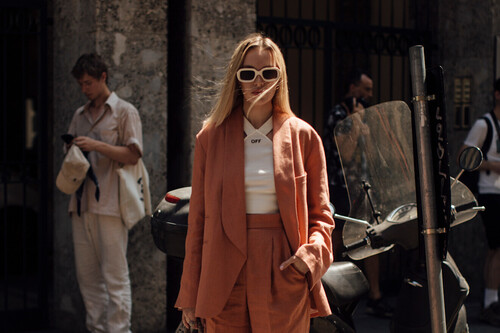 En esta propuesta, optamos por un dos piezas del mismo tono. Es una opción elegante perfecta para combinar con los jeans de Springfield y una americana a juego. Para añadir altura y estilo a este look, podemos combinarlo con unas alpargatas beige, que aportan un toque sofisticado. El bolso shopper trenzado es la elección ideal para darle un toque estival. Una opción perfecta para una reunión de trabajo, elegante y sencilla.