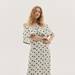 Para una boda de noche, siempre buscamos un look muy elegante y diferente. Yo me declaro fan de los lunares y me parecen un estampado muy top para llevar a las celebraciones más especiales. La combinación con el clavel y con los labios rojos, este vestido sube de tono y le aporta un toque más atractivo y delicado. Los zapatos de tacón con acabado en pico estilizan y lo convierten en un outfit muy acertado. Una cartera metalizada sería la mejor opción para añadir un detalle llamativo y moderno.