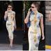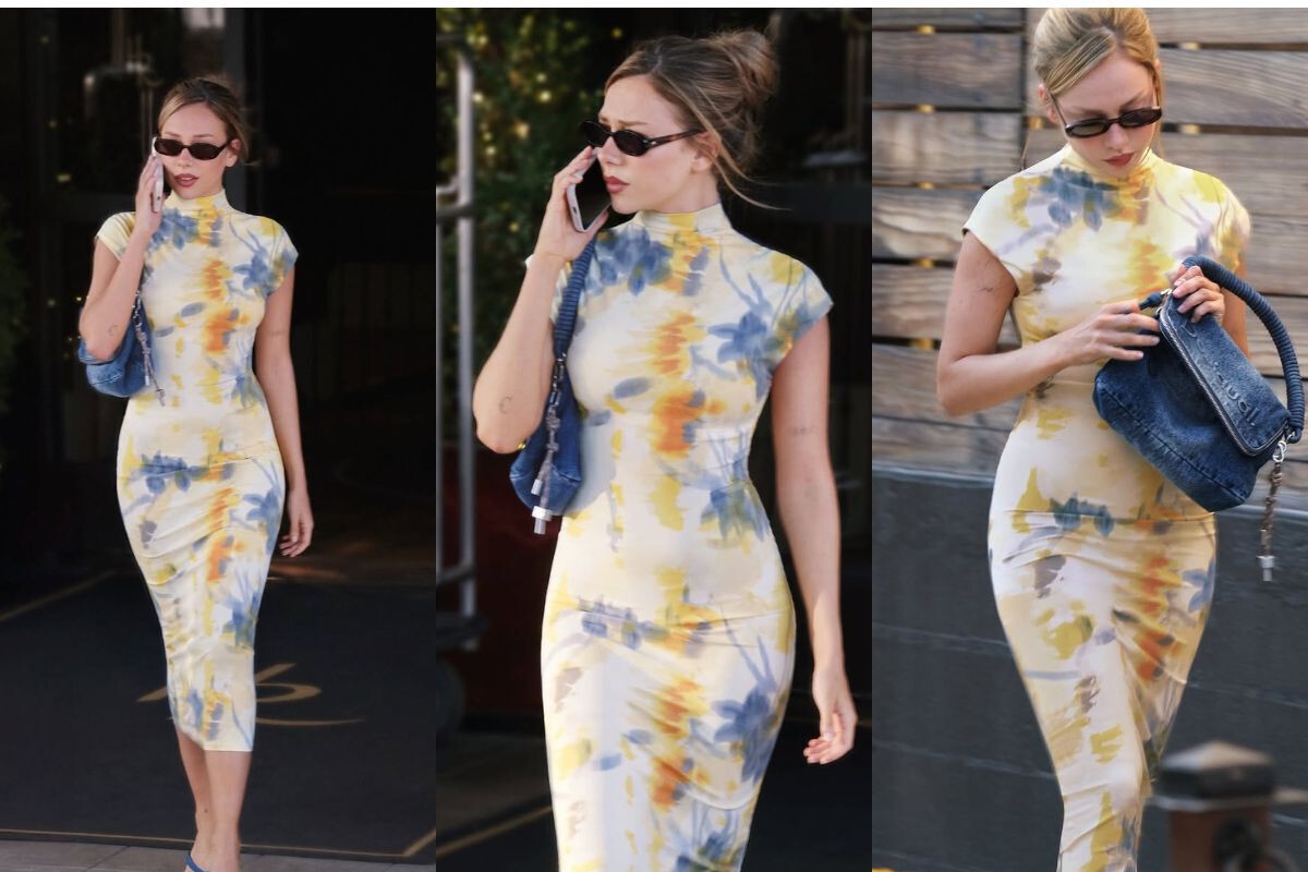 El diseño seguramente ponga un pelín nostálgicas a las millennials de la sala porque recuerda mucho a los que llevábamos a principios de los 00s: ajustado estilo tubo, cuello alto, manga corta -cortísima- y un tímido estampado tie-dye con flores difuminadas. Todo ello coronado con una mezcla de colores de lo más 2025: amarillo mantequilla, celeste y gris claro.