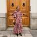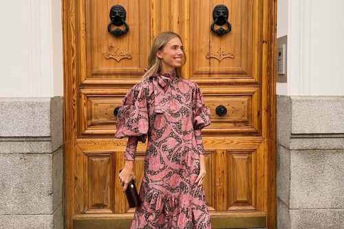 En esta propuesta, encontramos un vestido fluido estampado en color rosa con un detalle de una lazada al cuello que le da un aspecto más formal. Las mangas son abullonadas y está combinado con unas botas con puntera de pico y tacón sensato y bolso estilo cartera en tono negro. Sin duda, una opción increíble para una boda de noche. Para darle más brillo al look, yo habría optado por unas sandalias y un bolso en color dorado a juego con las joyas.