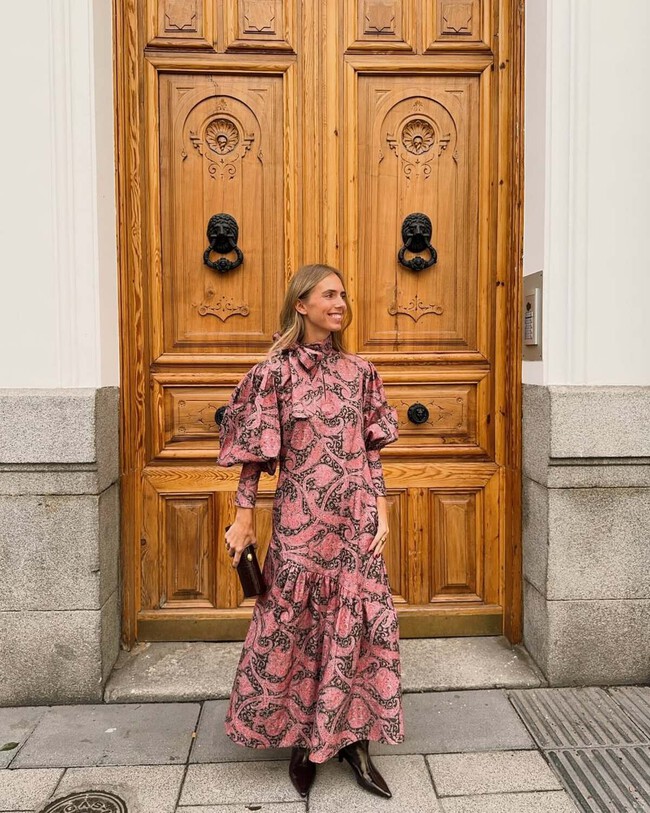 En esta propuesta, encontramos un vestido fluido estampado en color rosa con un detalle de una lazada al cuello que le da un aspecto más formal. Las mangas son abullonadas y está combinado con unas botas con puntera de pico y tacón sensato y bolso estilo cartera en tono negro. Sin duda, una opción increíble para una boda de noche. Para darle más brillo al look, yo habría optado por unas sandalias y un bolso en color dorado a juego con las joyas.