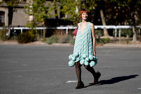 Sin duda, lo que más me gusta de este look es el bolso con la silueta de un perro salchicha. ¿Es arriesgado? Sí, pero le da un toque dulce y cool. Además, con la combinación de calcetines y tacones estilo mocasín, este vestido de rayas con escote bebé se transforma en un conjunto más moderno y actual. Es un balance perfecto entre lo divertido y lo sofisticado, ideal para quienes buscan un estilo único y atrevido para ir a la oficina o, simplemente, comer en la calle.
