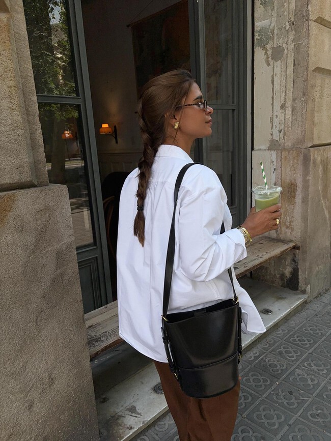 El bolso shopper negro es un acierto porque crea armonía visual, aunque si queremos arriesgar un poco, el marrón chocolate es más llamativo y queda genial. Conservando la esencia minimalista, un par de aros plateados serían una buenísima elección. ó