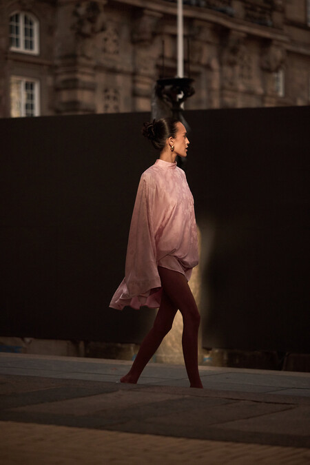 Las bohemias de la casa seguro que se identifican con este conjunto con brillo de diseño holgado con escote asimétrico. Su top tipo capa va de perlas para crear un estilismo entre folk y glamuroso, que pide a gritos una melena suelta con ondas suaves y accesorios dorados.