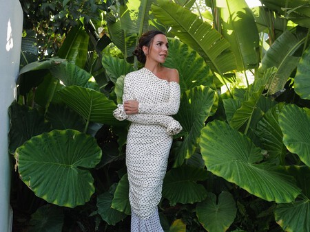 En Mango encontramos un vestido que parece sacado de la última colección de Carolina Herrera: negro, corte imperio, falda con vuelo y un maxi lunar blanco sobre fondo negro que pide a gritos un lápiz de labios rojo. Ideal para invitadas elegantes y con personalidad por 59,99 euros.