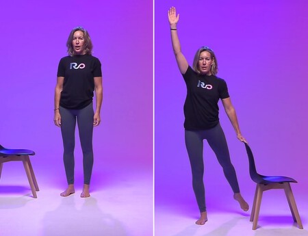 El tercer ejercicio combina equilibrio, coordinación y trabajo abdominal, todo con el respaldo de tener la silla como referencia. "Nos colocamos por detrás de la silla, de lado, elevamos el brazo y pierna contraria, buscamos codo y rodilla acercándolos, a la vez que flexionamos la columna. Metemos bien el ombligo, y cambiamos de lado. Brazo y pierna contrario, juntamos codo y rodilla, y volvemos", explica la profesora.
