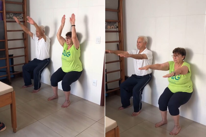 Apoya la espalda en la pared y separa ligeramente los pies hasta encontrar una postura cómoda. A continuación, flexiona las rodillas suavemente como si fueras a sentarte en una silla invisible, sin forzar la bajada. Desde esa posición, extiende los brazos hacia delante y después elévalos por encima de la cabeza antes de regresar al punto inicial.