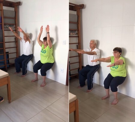 Apoya la espalda en la pared y separa ligeramente los pies hasta encontrar una postura cómoda. A continuación, flexiona las rodillas suavemente como si fueras a sentarte en una silla invisible, sin forzar la bajada. Desde esa posición, extiende los brazos hacia delante y después elévalos por encima de la cabeza antes de regresar al punto inicial.
