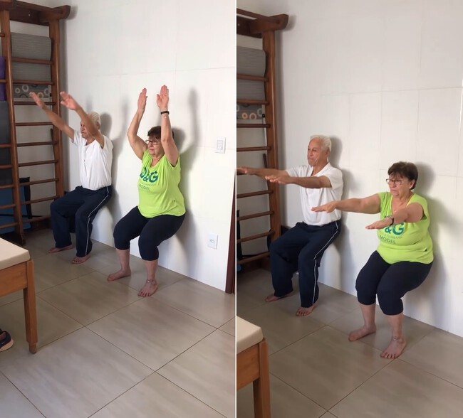 Este ejercicio combina trabajo de piernas, movilidad de hombros y control postural en un solo movimiento, y resulta especialmente útil para mantener la fuerza necesaria para sentarse y levantarse con facilidad, además de favorecer la coordinación entre la parte superior e inferior del cuerpo.