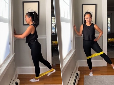 Cómo se realiza: Mantén la cinta elástica por encima de las rodillas. Apóyate en la pared con la mano derecha para buscar estabilidad. Desde una posición erguida, eleva la pierna derecha lateralmente hasta donde el control del movimiento lo permita, sin inclinar el tronco hacia el lado contrario. Regresa lentamente a la posición inicial, sin dejar caer la pierna. Repite el movimiento con la pierna izquierda, y realiza entre 10 y 12 repeticiones por cada lado.