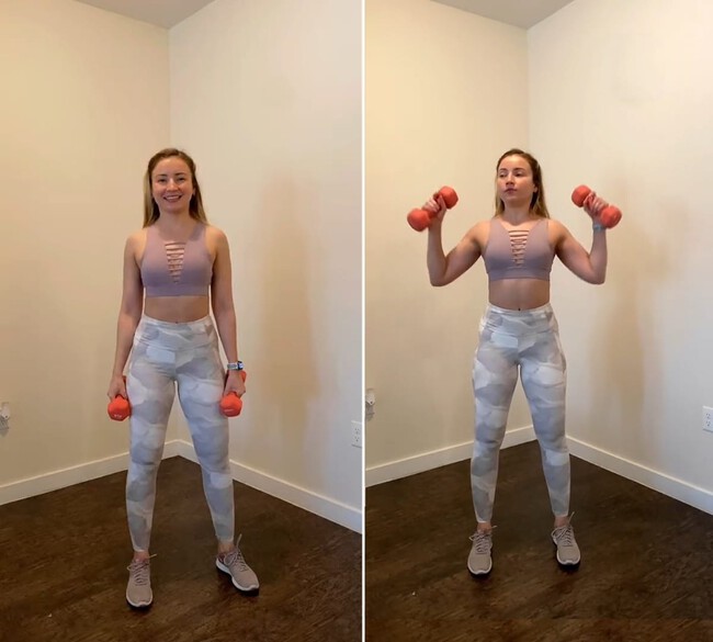 A continuación deberás preparar la posición inicial de los brazos, sujetando una mancuerna en cada mano, con las palmas mirando hacia adelante. Llévalas a la altura de la boca o del mentón, manteniendo los codos flexionados y alineados con las muñecas.