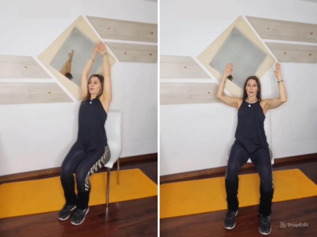 Este ejercicio es perfecto para para trabajar el abdomen inferior, mejorar la coordinación y activar también los flexores de cadera, todo sin impacto y sin comprometer la espalda baja. Siéntate en una silla con la espalda recta y sin apoyar la espalda en el respaldo. Estira los brazos totalmente por encima de la cabeza y entrelaza las manos.