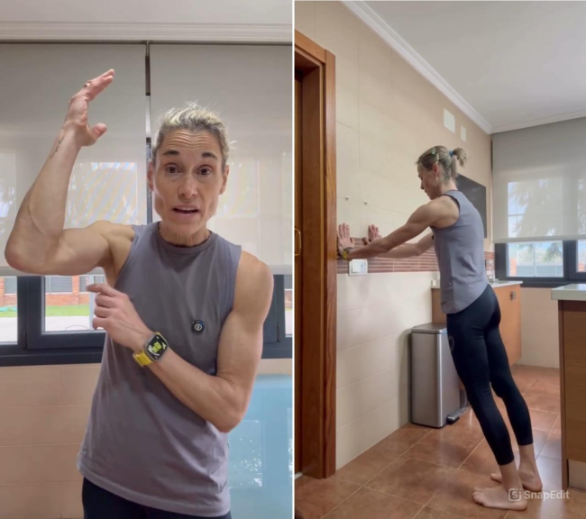 A la hora de combatir la flacidez de los brazos, esta entrenadora recomienda hacer flexiones de tríceps inclinadas, una versión de las tradicionales flexiones tradicionales que se realizan en el suelo. Pero en lugar de hacerlas en el suelo, se utiliza una pared o una superficie intermedia más elevada que el suelo, como una encimera. Este detalle permite que estas flexiones puedan ser realizadas por personas que todavía no tienen la fuerza suficiente como para realizar la versión habitual.