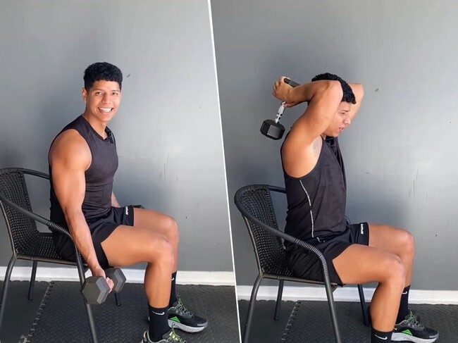 Permanece sentado en la silla, con la espalda recta. Coge una única mancuerna con ambas manos, sujetándola por uno de sus extremos. Lleva la mancuerna por encima de la cabeza, con los brazos completamente estirados. Desde esa posición, flexiona los codos y baja la mancuerna por detrás de la cabeza de forma controlada, manteniendo los codos apuntando hacia arriba.