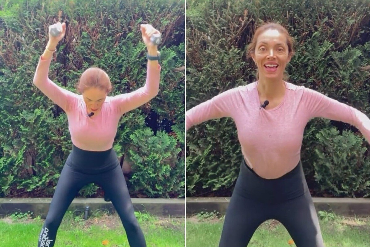 Para empezar, la instructora recomienda hacer un sencillo calentamiento, cogiendo una mancuerna en cada mano y colocando los pies separados a la anchura de tus hombros. A continuación, estira los brazos en cruz y flexiona los codos para llevar las mancuernas hacia el pecho.