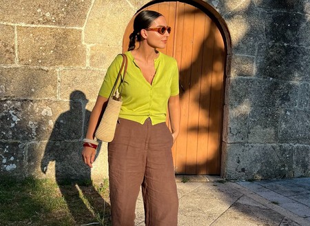 Toma un traje de chaqueta y cambia la americana formal por un cárdigan de punto de un color vistoso, como es este verde. Añade las New Balance y tendrás un estilismo laboral profesional en clave otoñal: calentito, agradable al tacto y con ese toque hogareño que da siempre el tejido de lana.