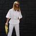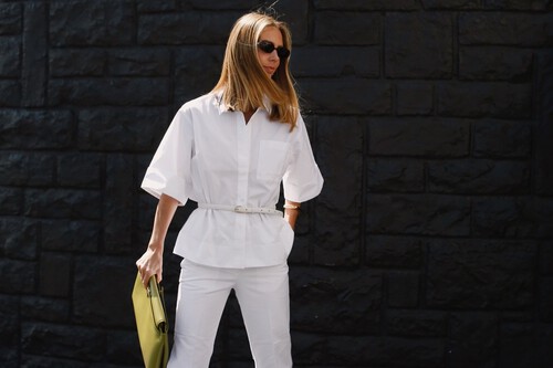 El primer de ellos consiste en una falda midi y una blusa ligera, ajustada a la cintura con un elegante cordón. Todo el conjunto es blanco nuclear, un lienzo perfecto para sumar colores atrevidos y vibrantes en primavera. Además, el cinturón tiene efecto satinado que levanta la sofisticación de todo el look.