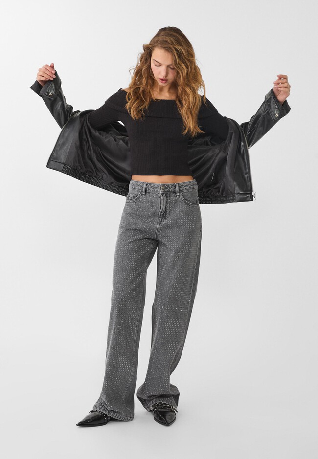 Pantalones vaqueros disponibles en gris y en negro, de tiro alto y pierna recta, con strass solo en la parte delantera, aportando un toque de glamour a los looks de día, y muy acertado para las noches de fiesta. Además, es un modelo que sienta muy bien porque estiliza notablemente. Su precio es de 39,99 euros.