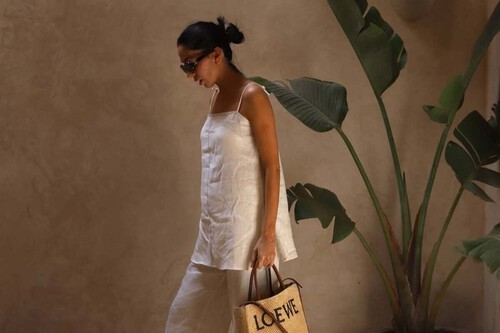 Si en su lugar te decantas por la versión de los pantalones en azul o beige, te recomendamos que la parte de arriba sea mejor en tonos más blancos, a juego con unas sandalias joya, para dar un poco más de luz al look. También puedes añadir un capazo, porque ya sabes que no se trata de un bolso exclusivo para los días de playa. Un estilismo ideal para una cita o una noche de amigas.
