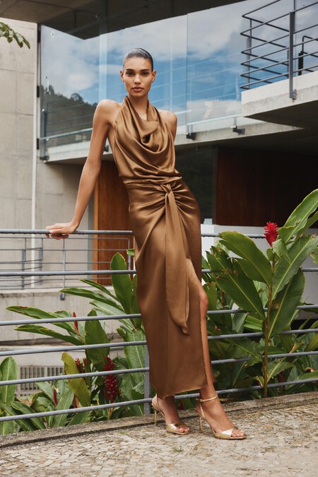 Me chifla este diseño tan sensual en un marrón dorado especial. Un vestido de cuello halter, espalda al aire y detalles fruncidos, muy acertado para un evento o simplemente para una cena más formal. Queda ideal con complementos dorados o en negro. Su precio es de 29,95 euros y ahora es de 19,99 euros.