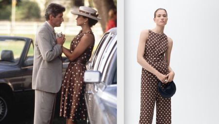 Un outfit con polka dress que Roberts (Vivian) escogió para su cita en el polo, y cuyo tejido fue encontrado por la diseñadora de vestuario en los almacenes Silks and Woolens de Los Ángeles. Marilyn lo quería largo para combinarlo con unos zapatos de tacón Chanel, pero como no había suficiente tela, lo hicieron por la rodilla y sobró para el sombrero. ¿El resultado? Sofisticado, femenino y elegante, un estilismo siempre presente en nuestra retina que perdura en nuestros días.