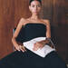 Vestido largo negro satinado, un modelo muy especial perteneciente a la colección cápsula de la firma catalana. Un diseño liso, de escote abullonado de hombros al aire, ideal para ocasiones especiales de noche. Glamour en estado puro. Su precio es de 159,99 euros.