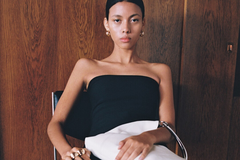 Vestido combinado de estilo minimalista, formado por cuerpo liso de escote palabra de honor y falda plisada. Su precio es de 79,99 euros. Una elección minimalista muy sofisticada, ideal para lucir de la mañana a la noche.