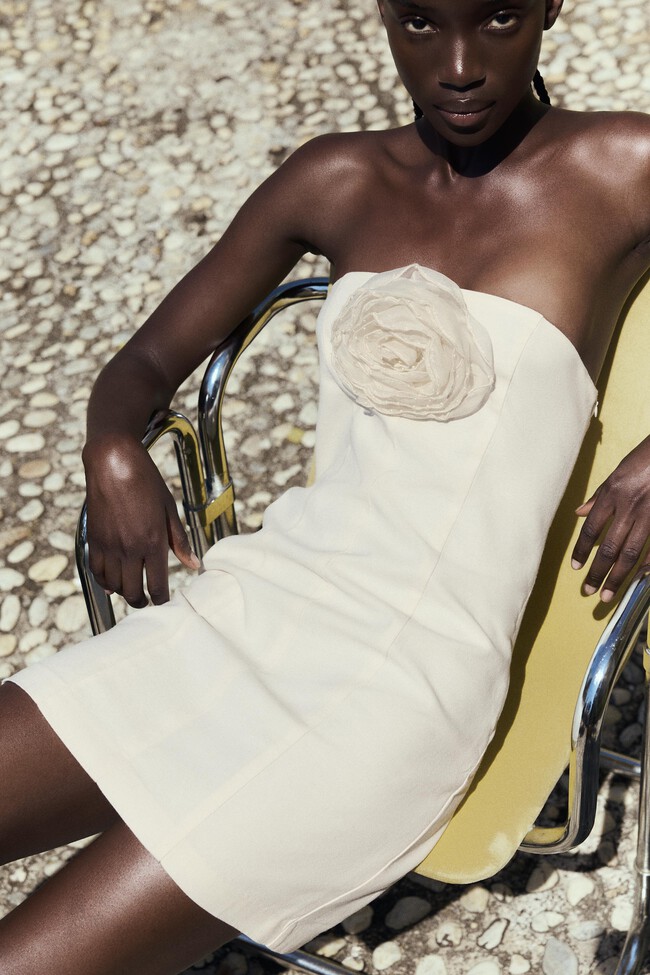 Mini vestido blanco de palabra de honor ideal para un evento de noche. Un diseño con detalle de maxi flor en el escote. Su precio era de 29,95 euros y ahora es de 5,99 euros.