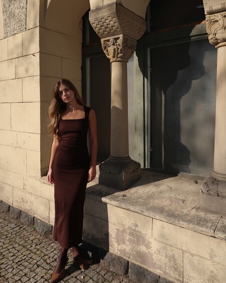 Ajustado maxi vestido marrón con detalles fruncidos y escote cuadrado, una apuesta muy sencilla para lucir de día con sandalias de tacón sensato y de noche con maxi pendientes y tacón alto. Su precio es de 19,99 euros.